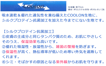 ●優れた吸水力・快速乾燥・涼しい通気性のあるCOOLON生地に、シルクプロテイン抗菌加工を加え、高い保湿効果と熱伝導率が低いため寒い外気を遮断してくれます。